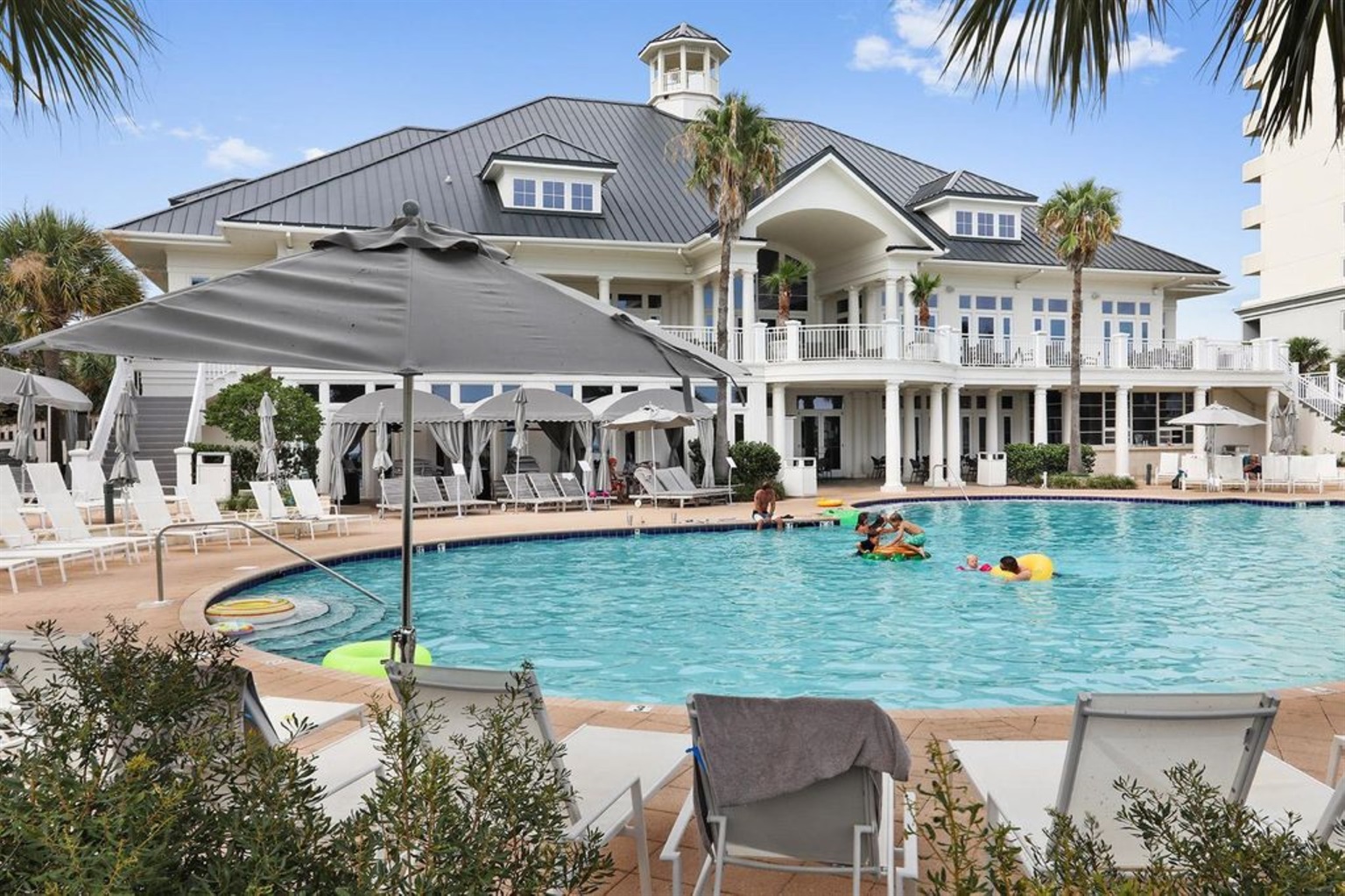 Without any additional fees, you will have access the beautiful pool, hot tub, wading pool, and restrooms at the foot of the tower, plus access to the boardwalks, playground, basketball courts, charcoal grills and tram services. Additionally, you may patron the salon and fine dining restaurant and bar, with gulf view, at the clubhouse, and you may patron the sports bar & grill with an arcade, beach & apparel shop, coffee and ice cream shops near the entrance of the resort.