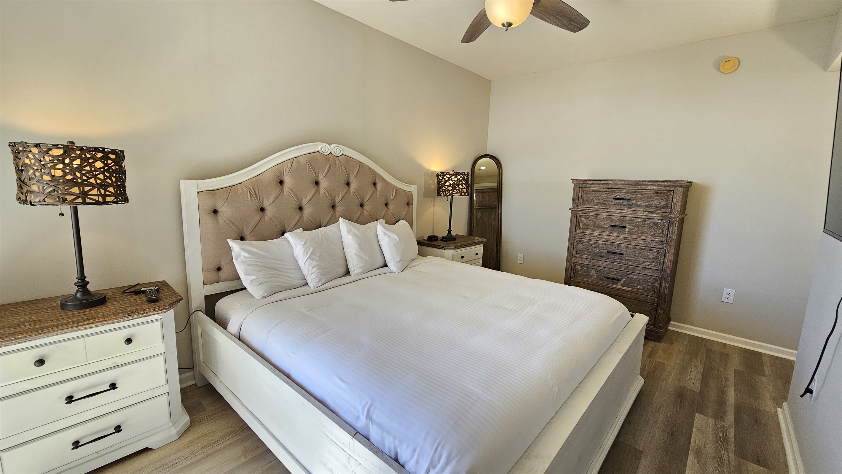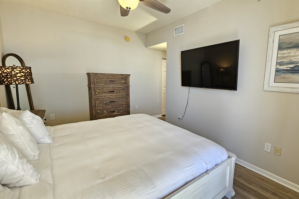 The living room furniture is very comfortable and the spacious dining area offers seating for your entire party. The living room and master bedroom adjoin the balcony. The kitchen is fully equipped, just bring the food and your paper goods products. Sleeps 6 in beds. The master bed is a king size and there are two full size beds in the guest bedroom. Both privately, adjoin a bathroom. There is a sleeper sofa. The beds are made with crisp white linen. Fluffy white bath linen is supplied, so bring make up removal wipes. Whether you choose to dine-in or out, you will enjoy the granite counters and a full kitchen with a combo washer/dryer. There is a one day set up of basic complimentary amenities. Please plan to shop for your additional needs. Wireless internet is available in the condo and throughout the property.