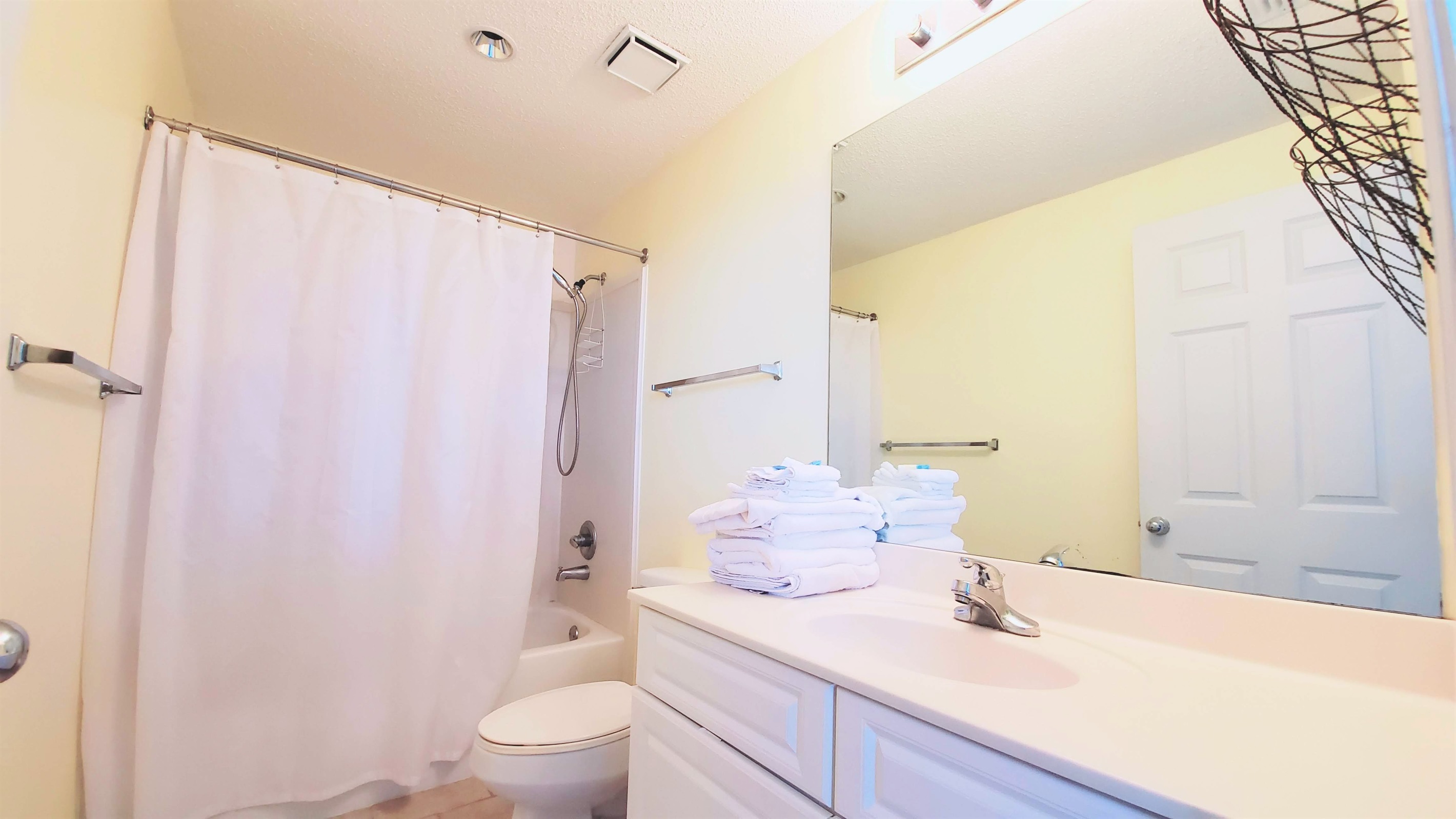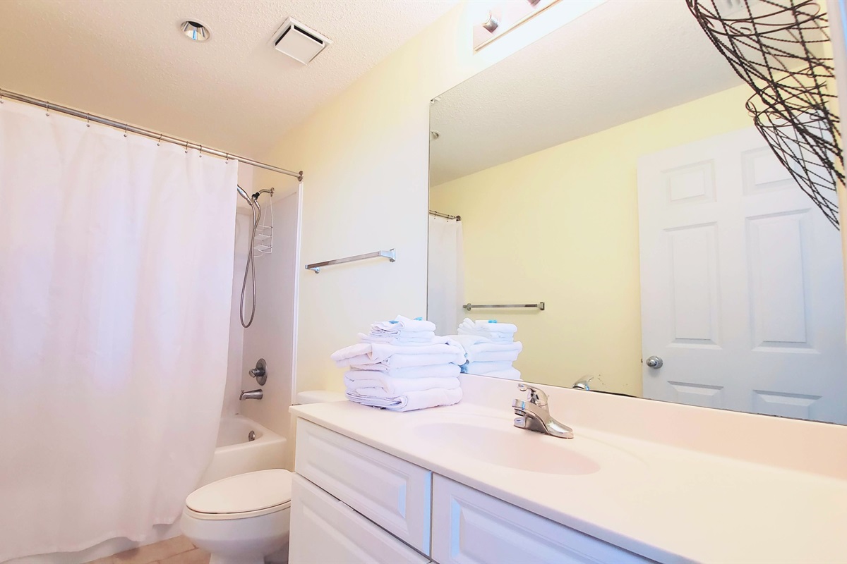This condo is great for couples! The king master bedroom privately adjoins a double sink vanity with a walk-in closet and a large jetted tub. The queen guest room privately adjoins a full bath. The King guest room adjoins a private full bath. The half bath is located in the entry area and is convenient for all. All bedrooms have plenty of storage furniture, a flat screen TV and DVD player. Hairdryers are Not supplied. The kitchen is well appointed with everything needed for meal preparation. The appliances are full size and includes a dishwasher. Coffee maker, blender, toaster, hand mixer and can opener are provided. The washer/dryer is conveniently located in the utility area. Bed, sofa sleeper, bath and kitchen linens are provided. Bring your beach towels. A "One Day" supply of these basic items are stocked for your convenience: coffee, paper towels, dish washing detergent, clothes detergent, trash bag, toilet tissue, bath soap, shampoo, and conditioner. Please bring your make up removal wipes.