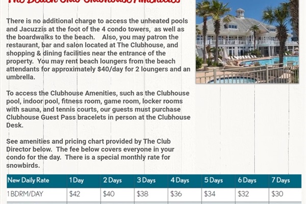 Wireless internet is available in the condo and throughout the property. Towels and linens are provided (including a set for the sofa). There is a one day set up of basic complimentary amenities, and onsite shopping for your food items and beach supplies. It is well maintained and cleaned privately, satisfaction is promised. The property manager is just 2 minutes away for your every need during your stay. The beautiful Avalon pool, hot tub and boardwalk to the beach are just at the foot of the tower, and are complimentary to our guests. There is an additional fee to access the Clubhouse amenities including: Indoor heated pool, outdoor pool, jacuzzi, wading pool, tennis courts, basketball courts, children activities, poolside live entertainment, game room, ping pong, cabana bar and outdoor dining. For the entire party in the condo, the charge is approximately $45 and is paid directly to The Beach Club on-site. The Clubhouse Amenities fee will only be charged for the days used and covers everyone in your group . Also at The Club House, without a fee, you may enjoy the fine dining restaurant, salon, and spa. At the front of the property is shopping and a dining buffet, short order deli style market. The Beach Club is a wonderful luxury resort for all ages, far from the crowds and well blended with its natural surroundings. Come watch the dolphins, crabs, fish, turtles or para-sail or kayak with a friend.