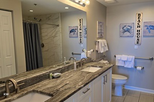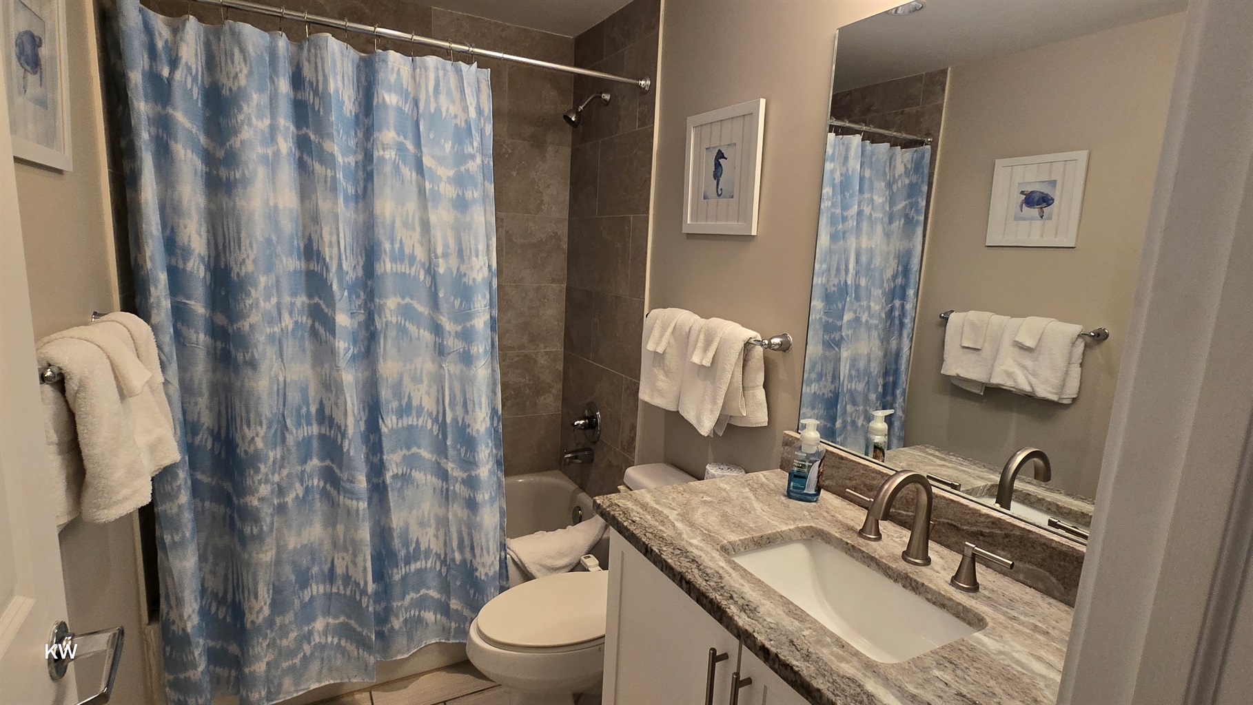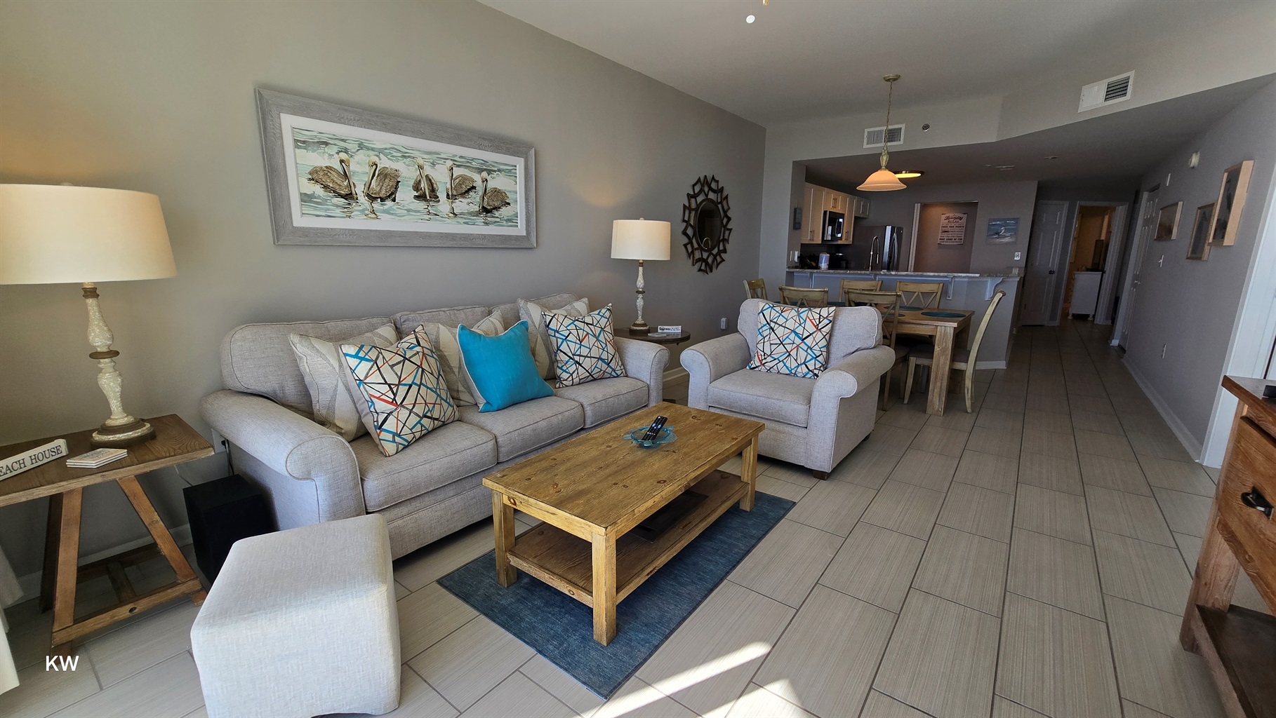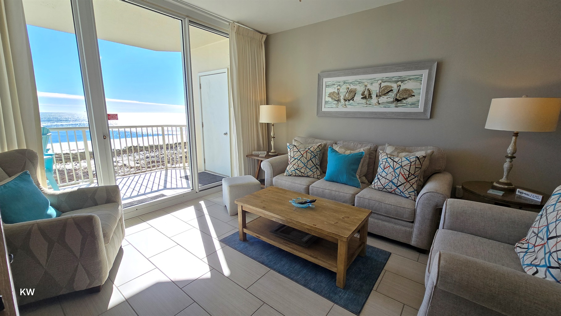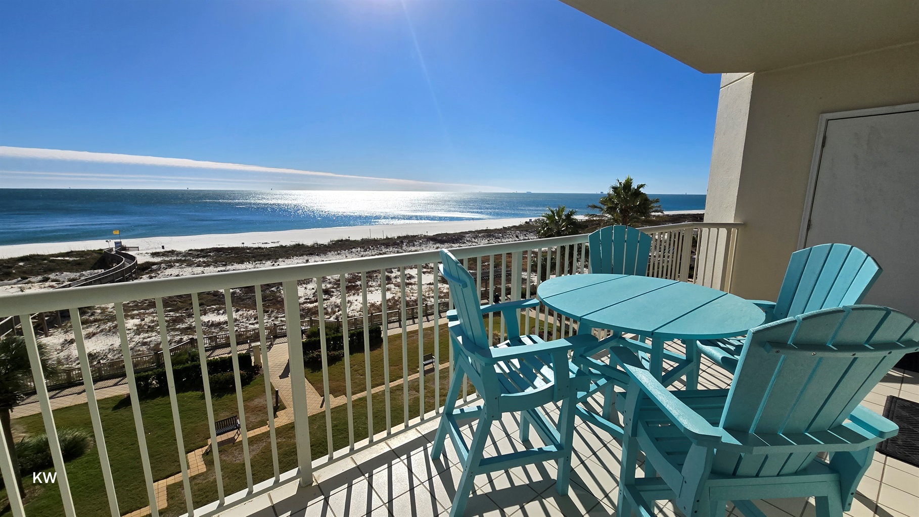 B502 has a furnished balcony for dining or sipping on something cool while watching the dolphins play in the Gulf! The fully stocked kitchen with full size appliances is ready for all your meal preparation. The primary bedroom provides a peaceful retreat with a king bed, floor to ceiling windows with balcony access, and an ensuite bathroom featuring a double sink vanity and a large tiled walk in shower. The second bedroom is ideal for kids or additional guests, with one twin bed and one full bed and a private ensuite bathroom with a tub/shower combo. An additional half bath is accessible from the hallway. Washer and dryer in laundry room off the kitchen.