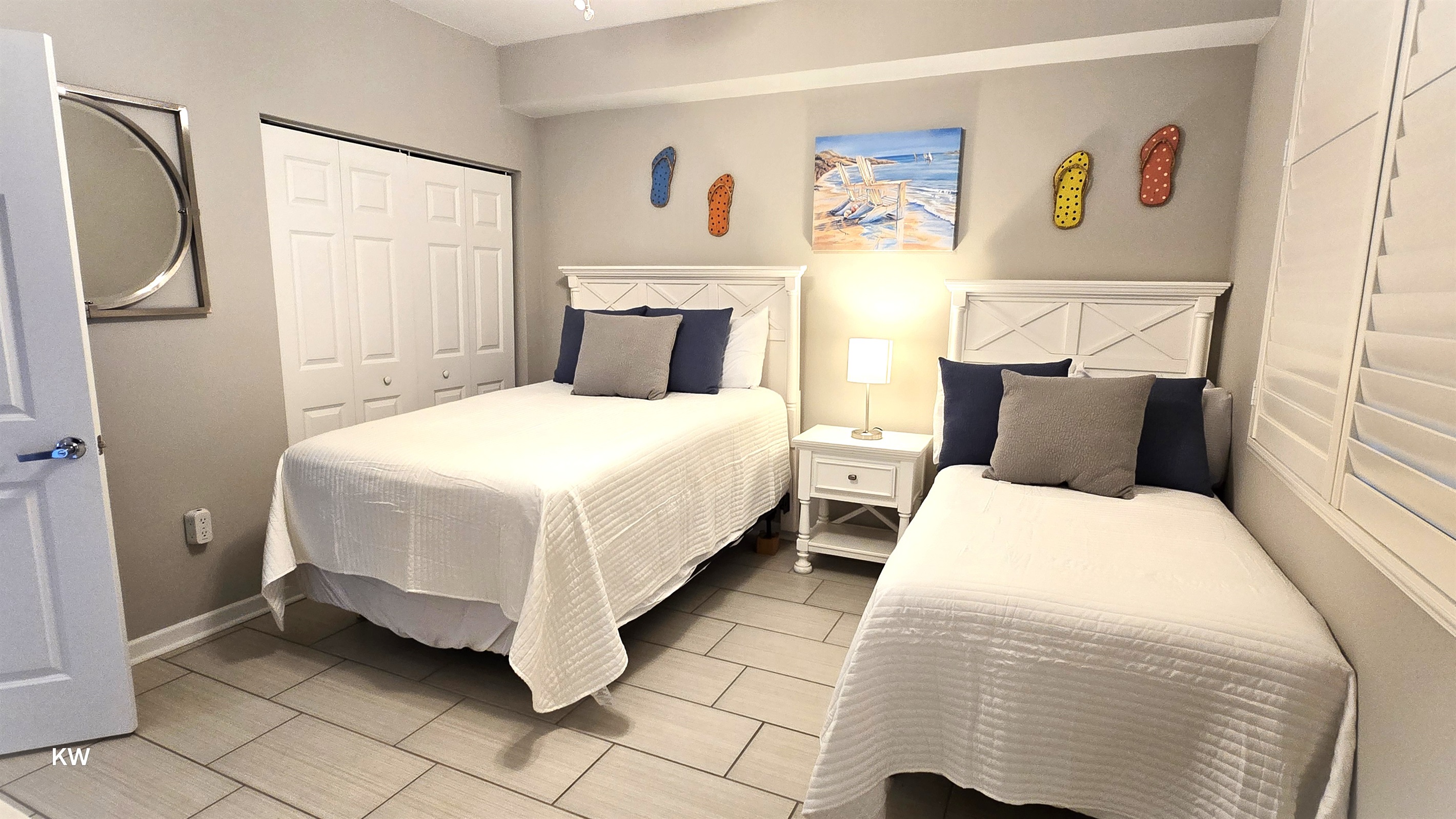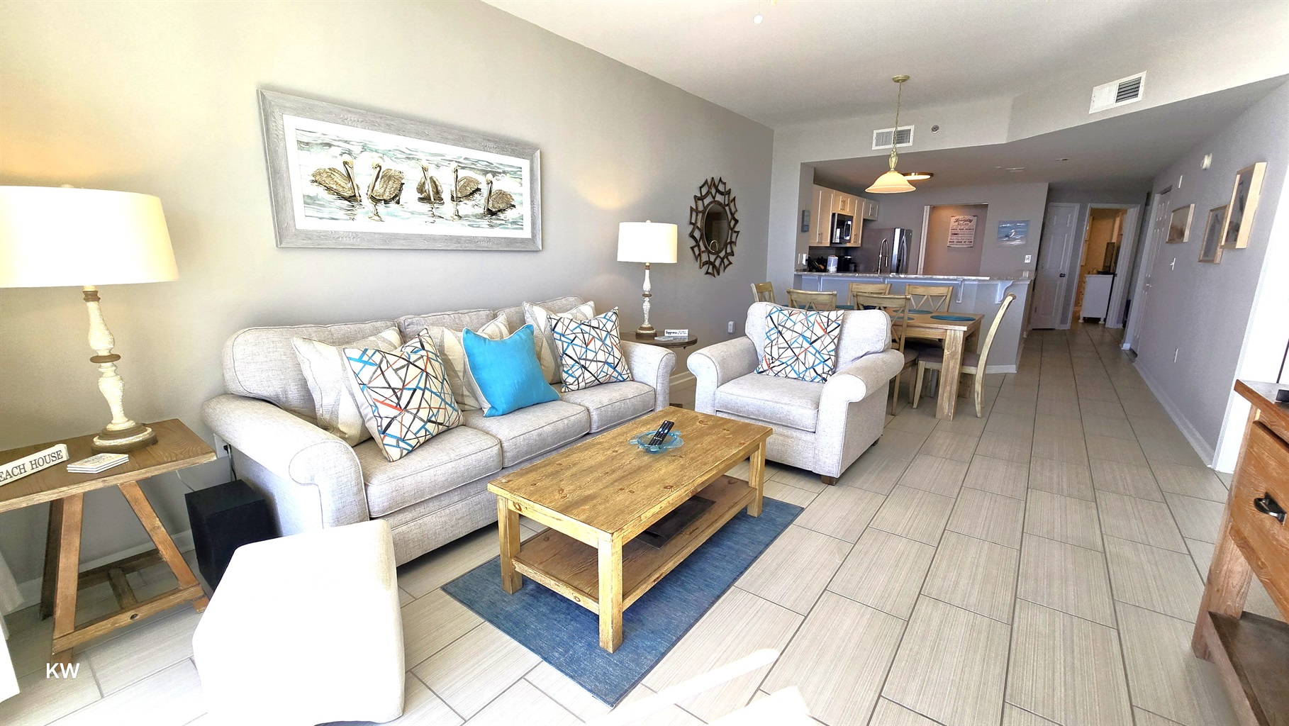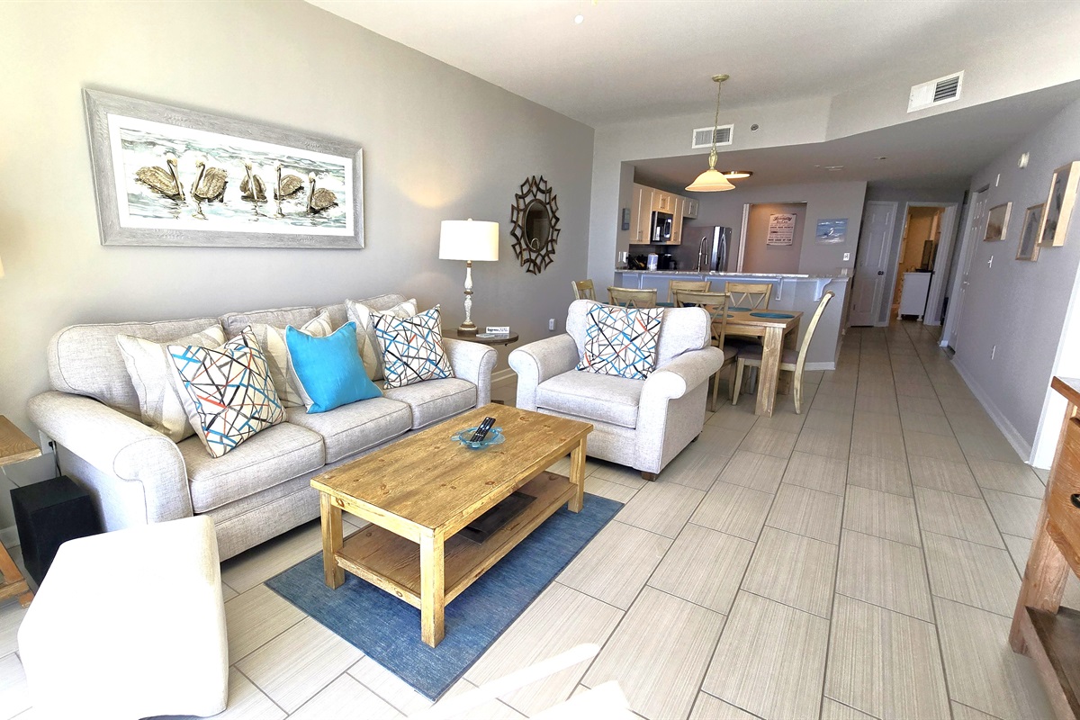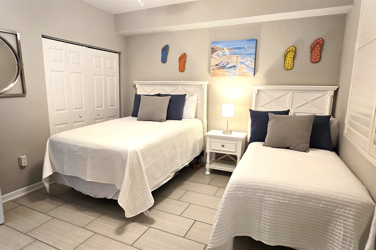 B502 has a furnished balcony for dining or sipping on something cool while watching the dolphins play in the Gulf! The fully stocked kitchen with full size appliances is ready for all your meal preparation. The primary bedroom provides a peaceful retreat with a king bed, floor to ceiling windows with balcony access, and an ensuite bathroom featuring a double sink vanity and a large, tiled walk-in shower. The second bedroom is ideal for additional guests, with one twin bed and one full bed, plus and a private ensuite bathroom with a tub/shower combo. An additional half bath is accessible from the hallway. Washer and dryer in laundry room off the kitchen. There is no sofa sleeper.