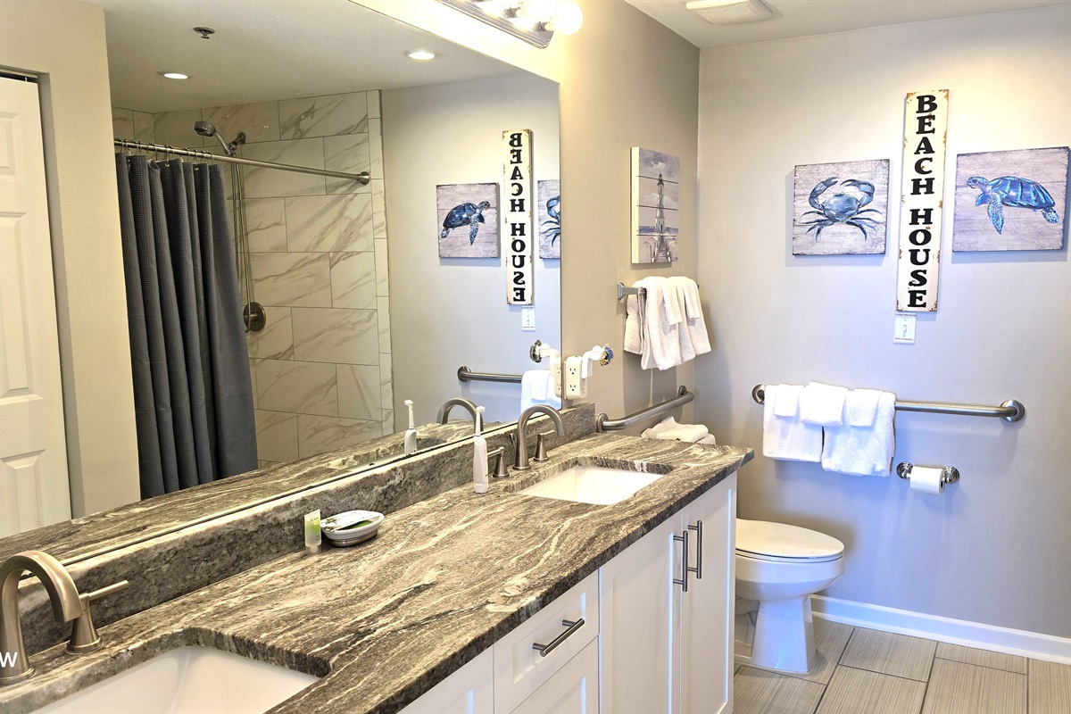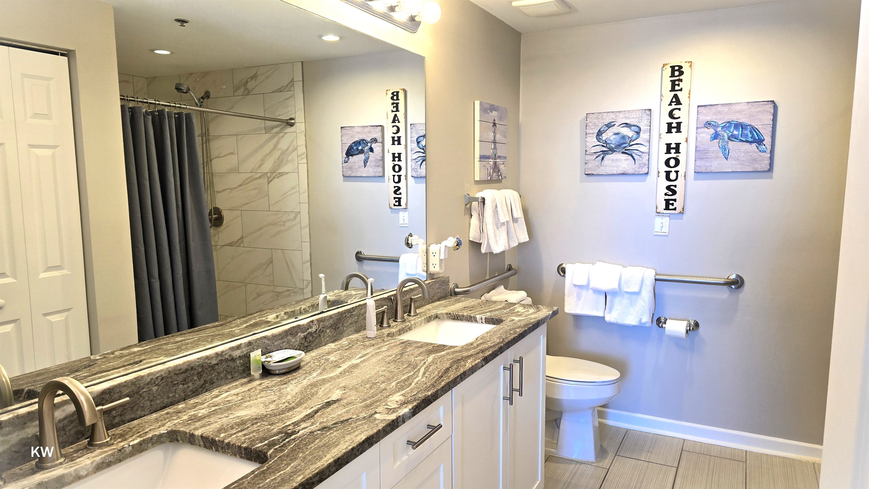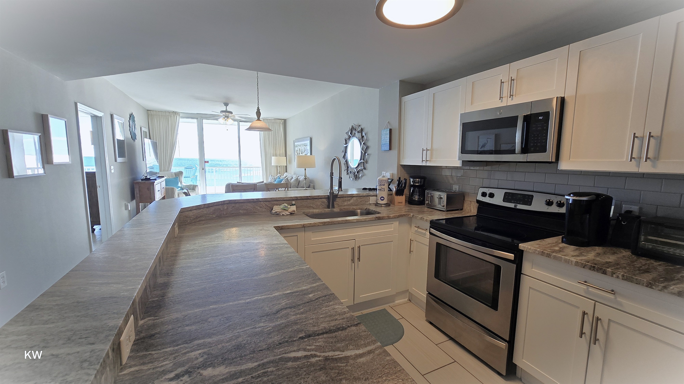 B502 has a furnished balcony for dining or sipping on something cool while watching the dolphins play in the Gulf! The fully stocked kitchen with full size appliances is ready for all your meal preparation. The primary bedroom provides a peaceful retreat with a king bed, floor to ceiling windows with balcony access, and an ensuite bathroom featuring a double sink vanity and a large, tiled walk-in shower. The second bedroom is ideal for additional guests, with one twin bed and one full bed, plus and a private ensuite bathroom with a tub/shower combo. An additional half bath is accessible from the hallway. Washer and dryer in laundry room off the kitchen. There is no sofa sleeper.