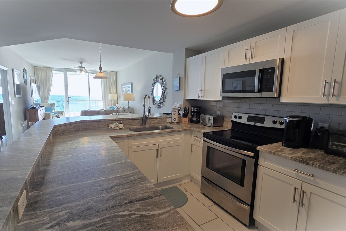 The beds are made with white linen and bath linens are supplied. The kitchen is equipped with full size appliances, including a dishwasher, plus a coffee maker, toaster, blender, mixer, and can opener. The cabinets are stocked with dishes, utensils, and cookware. Please bring food, coffee, garbage bags, other disposable products and detergents. There is a full size washer and dryer inside the condo for your convenience.