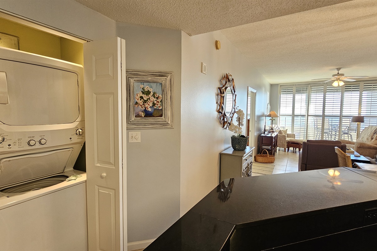 The kitchen is equipped with full size appliances, including an automatic dishwasher, plus a coffee maker, toaster, blender, mixer, and can opener. The cabinets are stocked with dishes, utensils, and cookware. A stack washer/dryer is in the utility closet by the kitchen. Please bring food, coffee, garbage bags, other disposable products and detergents.