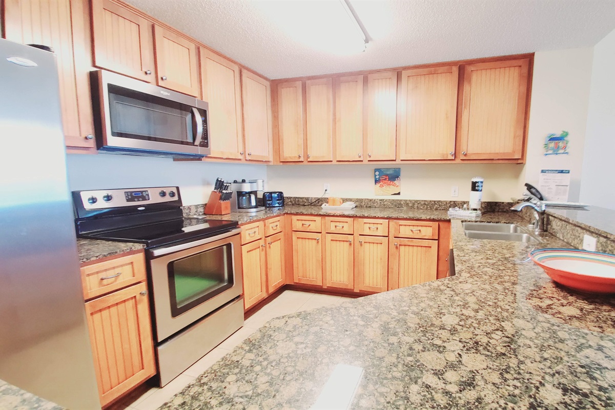 The kitchen is equipped with full size appliances, including an automatic dishwasher, plus a coffee maker, toaster, blender, mixer, and can opener. The cabinets are stocked with dishes, utensils, and cookware. A stack washer/dryer is in the utility closet by the kitchen. Please bring food, coffee, garbage bags, other disposable products and detergents.