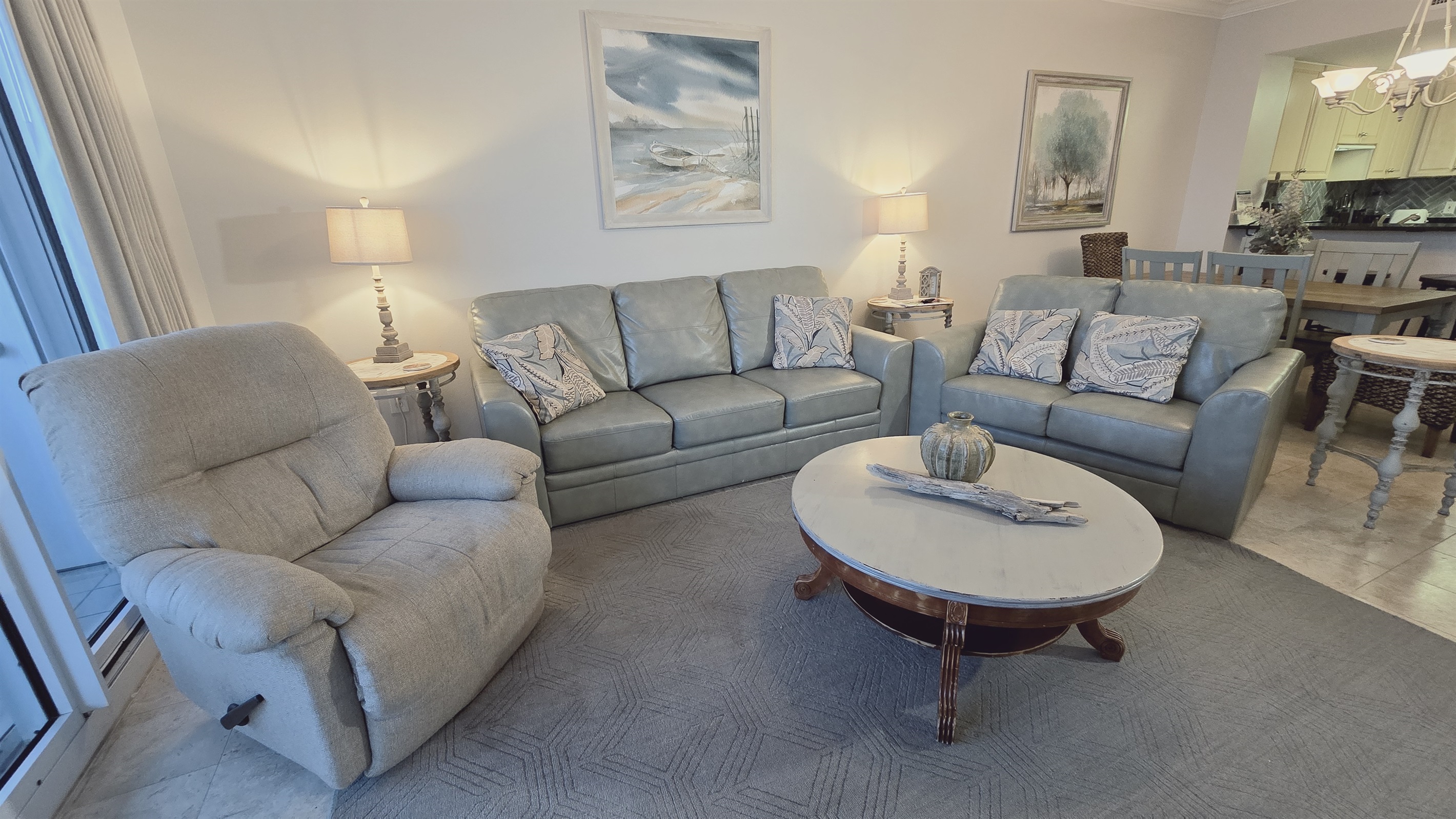 The condo sleeps 6 in beds and 2 on the sleeper sofa. The bedding arrangement is King in master, Queen in first guest room, a Twin Daybed with a Twin Trundle bed in the second guest room, sofa sleeper. All of the beds are made with white linen and a set is provided for the sofa. Bath linen is provided along with a "one day" supply of toiletries and tissue paper. Please bring beach towels, make up removal wipes, toilet tissue and toiletries.