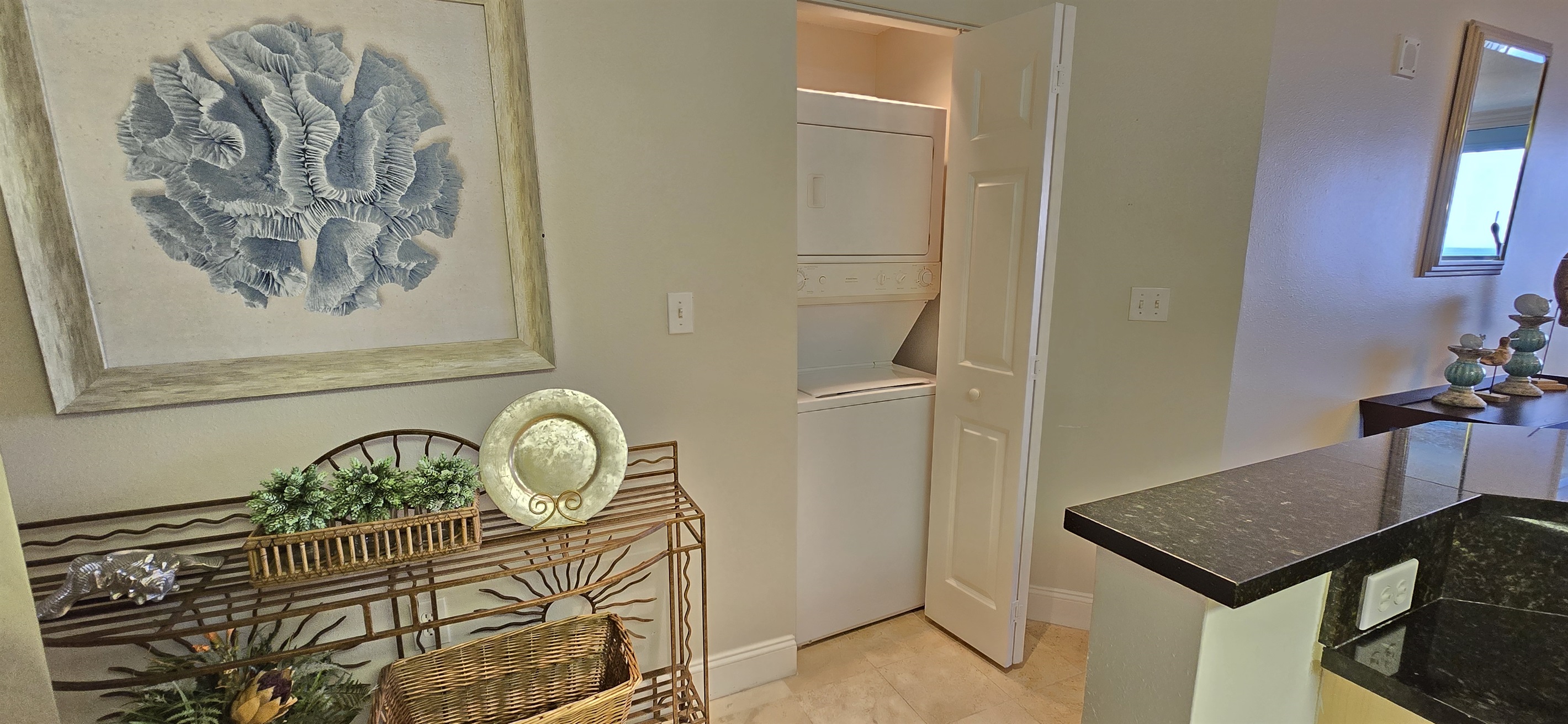 The kitchen is equipped with full size appliances, including an automatic dishwasher, plus a coffee maker, toaster, blender, mixer, and can opener. The cabinets are stocked with dishes, utensils, and cookware. A stack washer/dryer is in the utility closet by the kitchen. Please bring food, coffee, garbage bags, other disposable products and detergents.