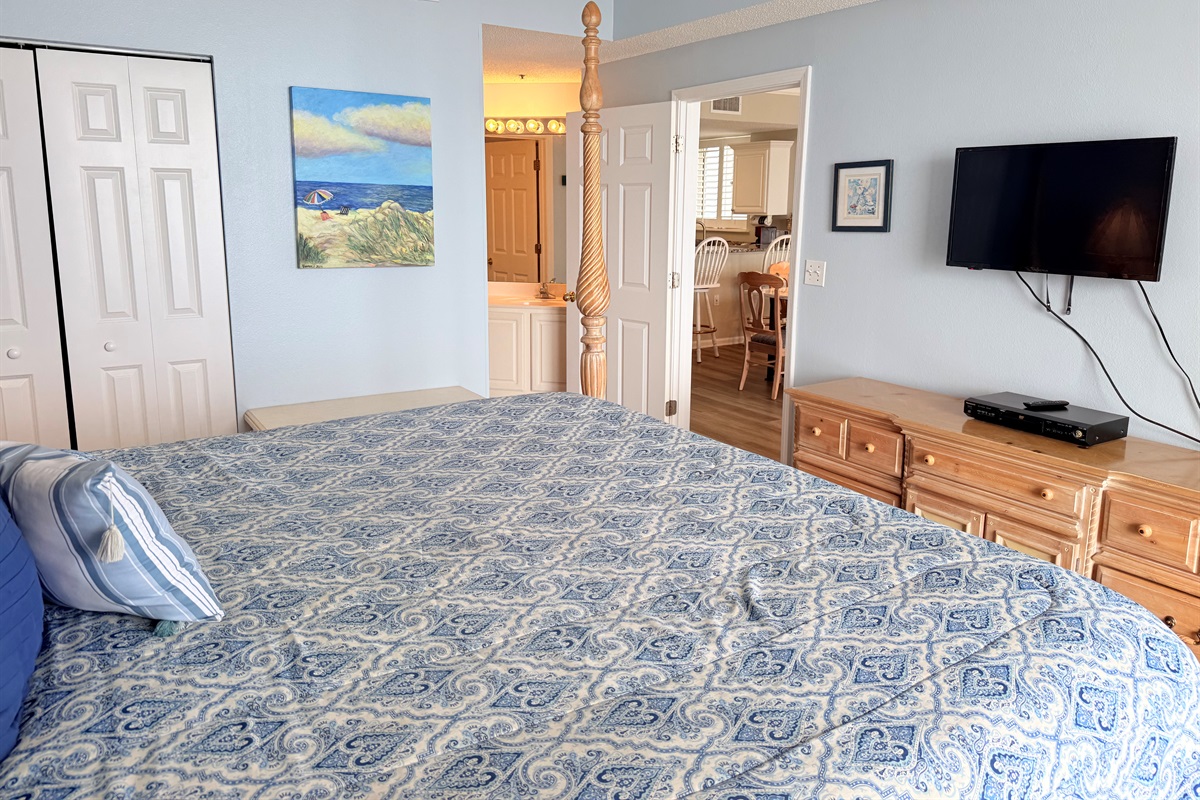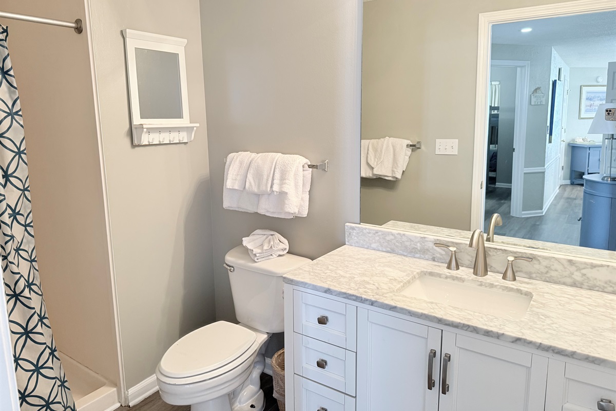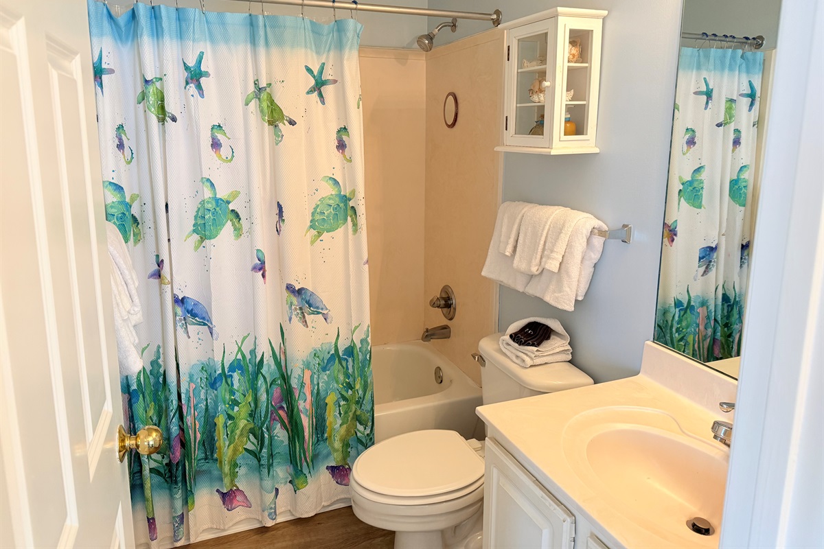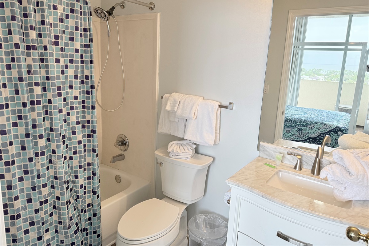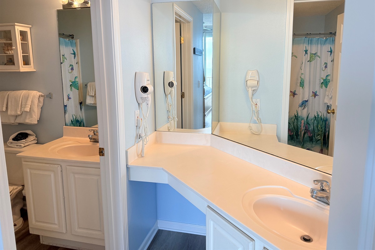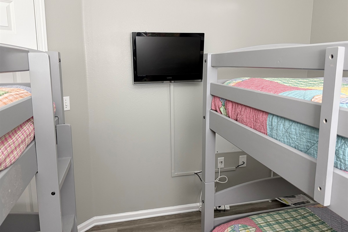 The master bedroom with a King bed adjoins a private bath with separate vanity area and has a tub/shower combo. The Queen Bedroom adjoins its own private bath with a tub/shower combo. The third bedroom has 2 sets of bunk bed and sleeps 4! It is located across from the third bath in the foyer area. This bath has a shower stall, allowing easy access for all!