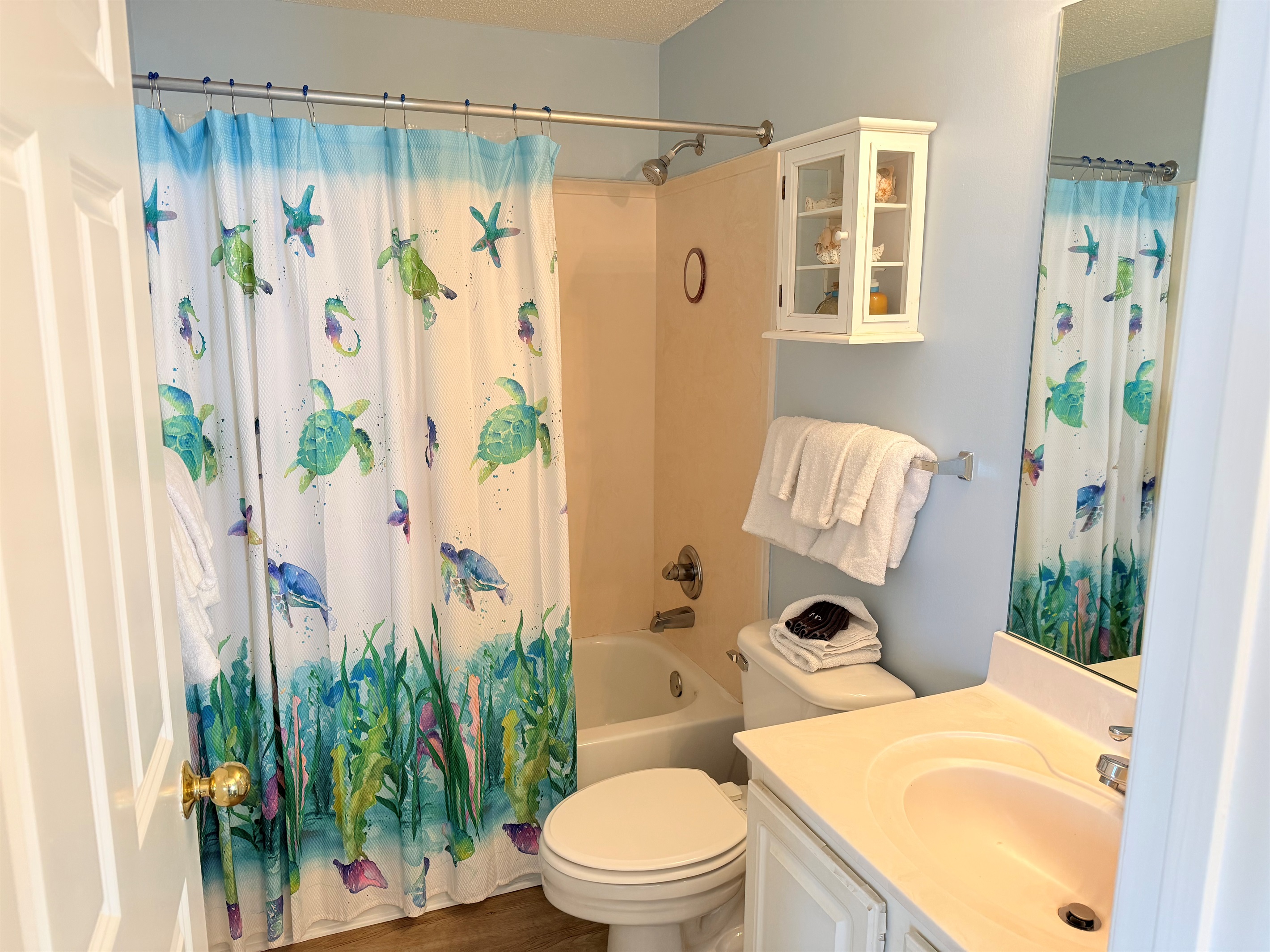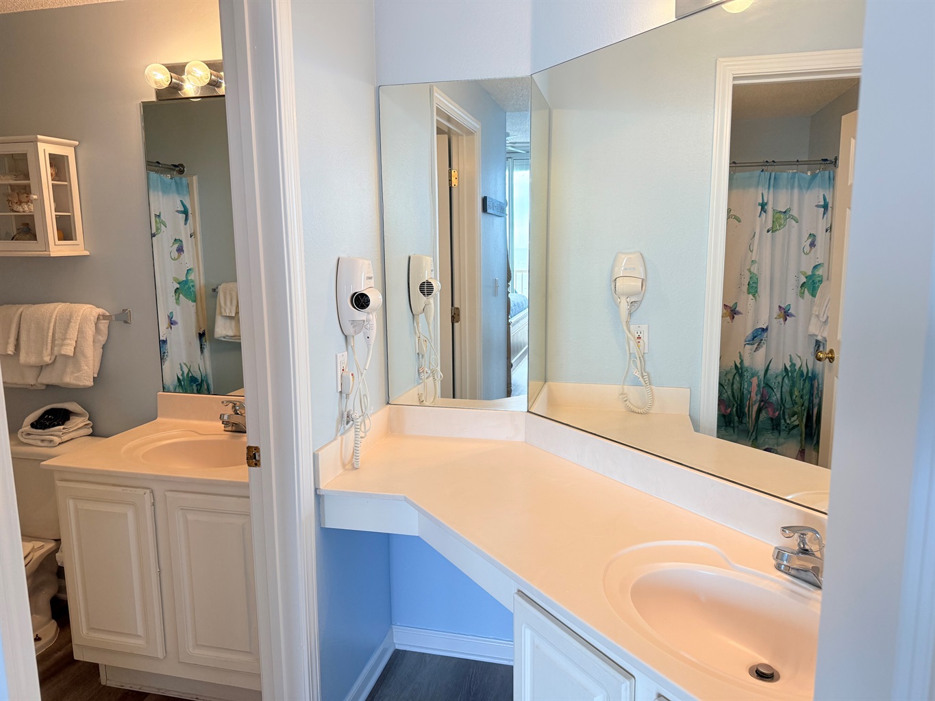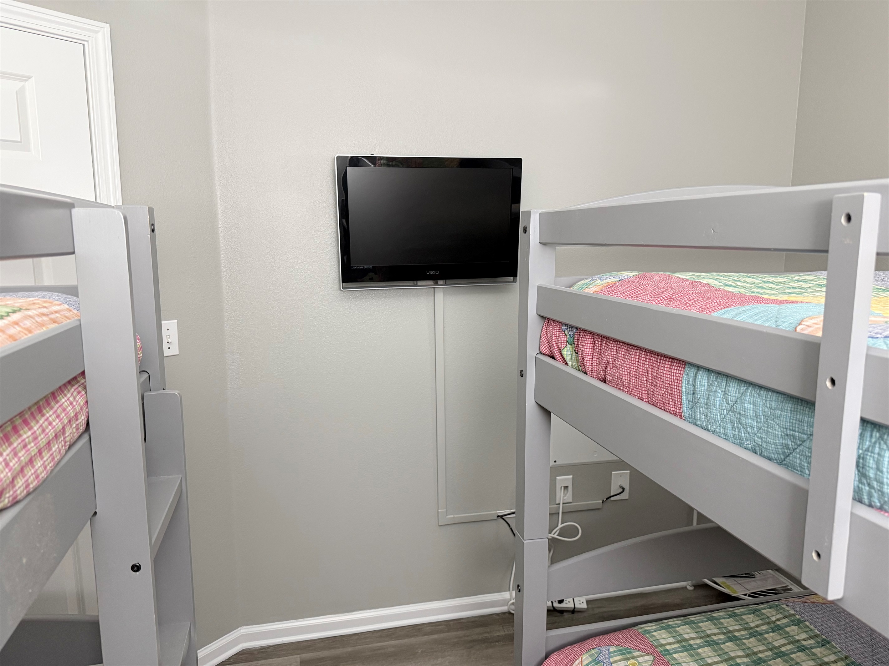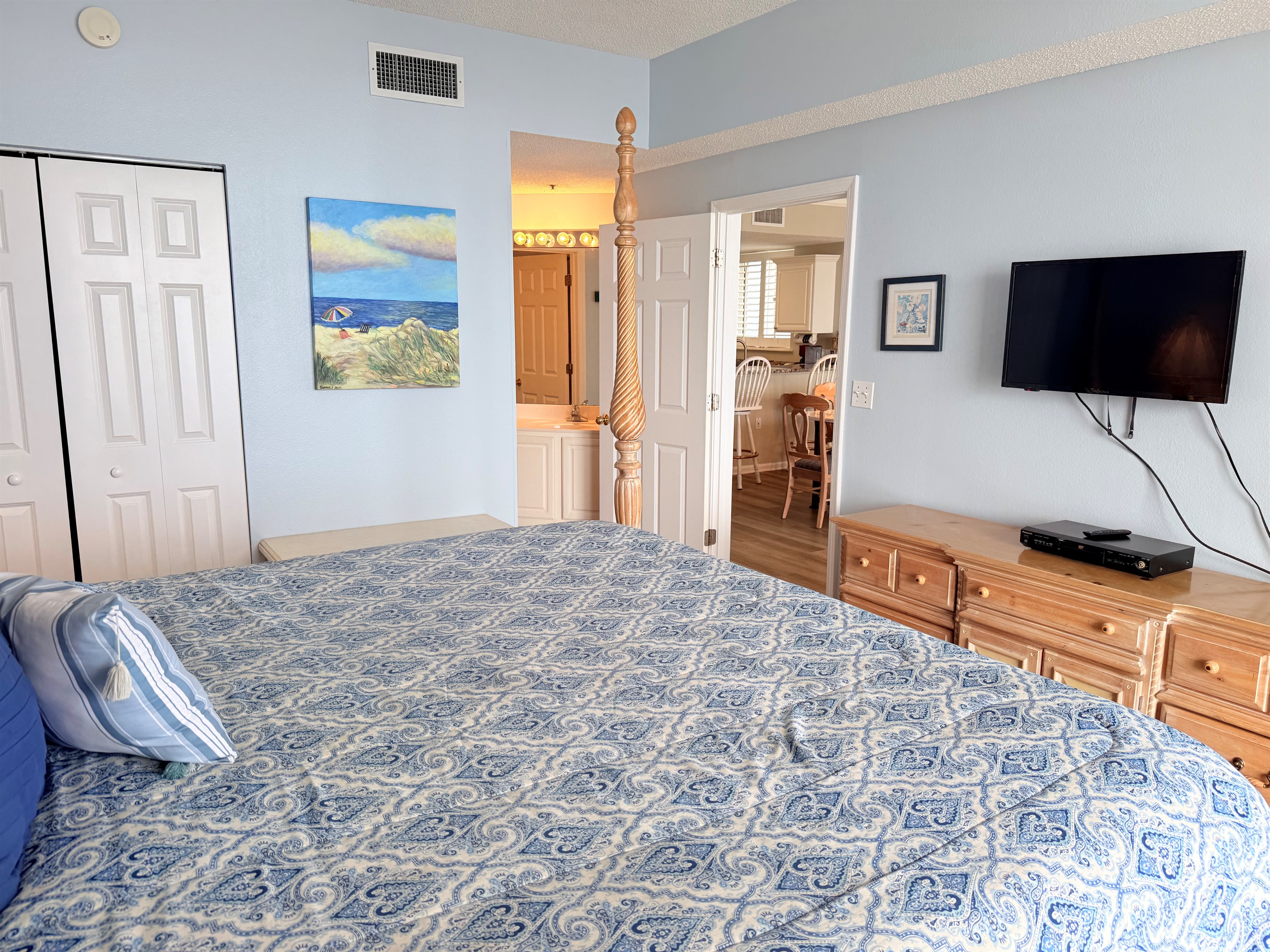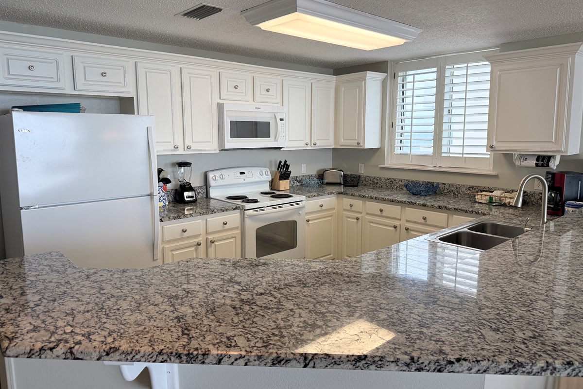 The master bedroom with a King bed adjoins a private bath with separate vanity area and has a tub/shower combo. The Queen Bedroom adjoins its own private bath with a tub/shower combo. The third bedroom has 2 sets of bunk bed and sleeps 4! It is located across from the third bath in the foyer area. This bath has a shower stall, allowing easy access for all!