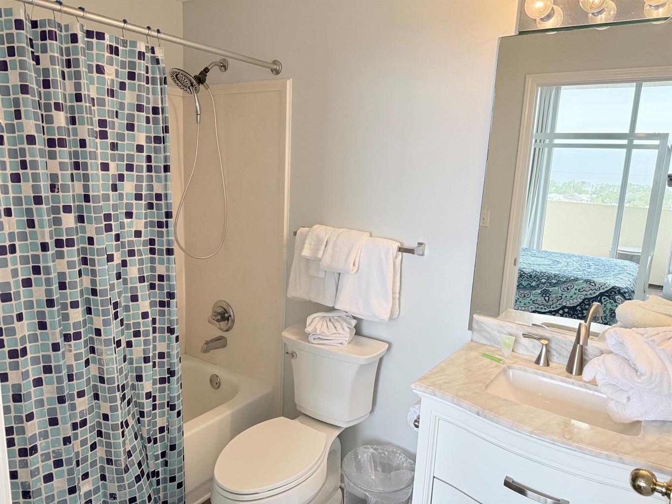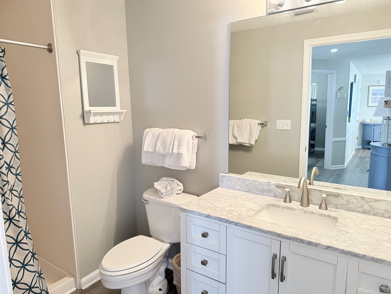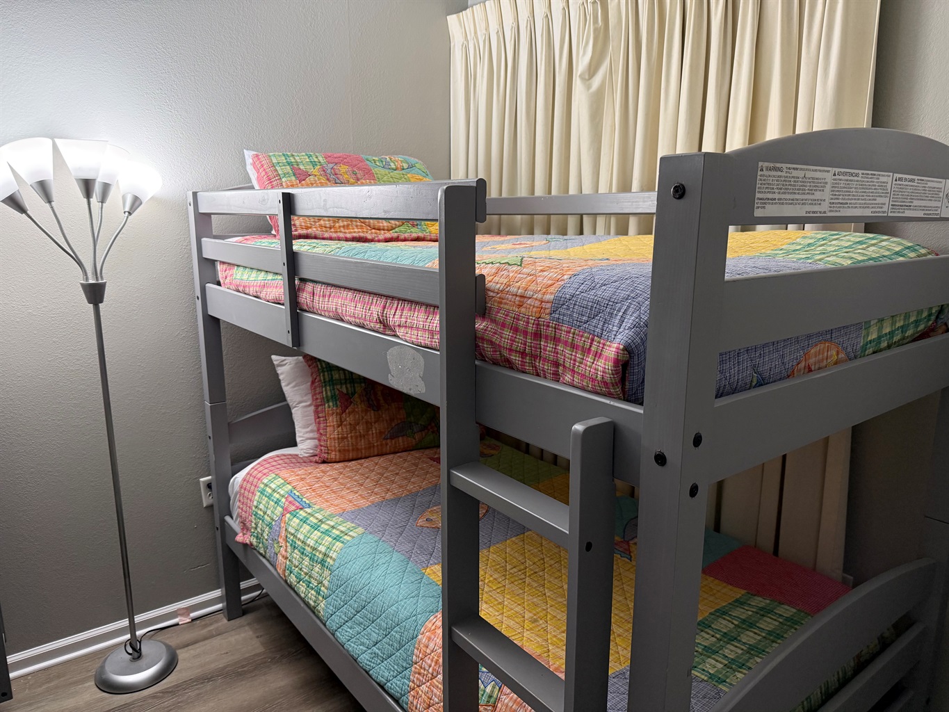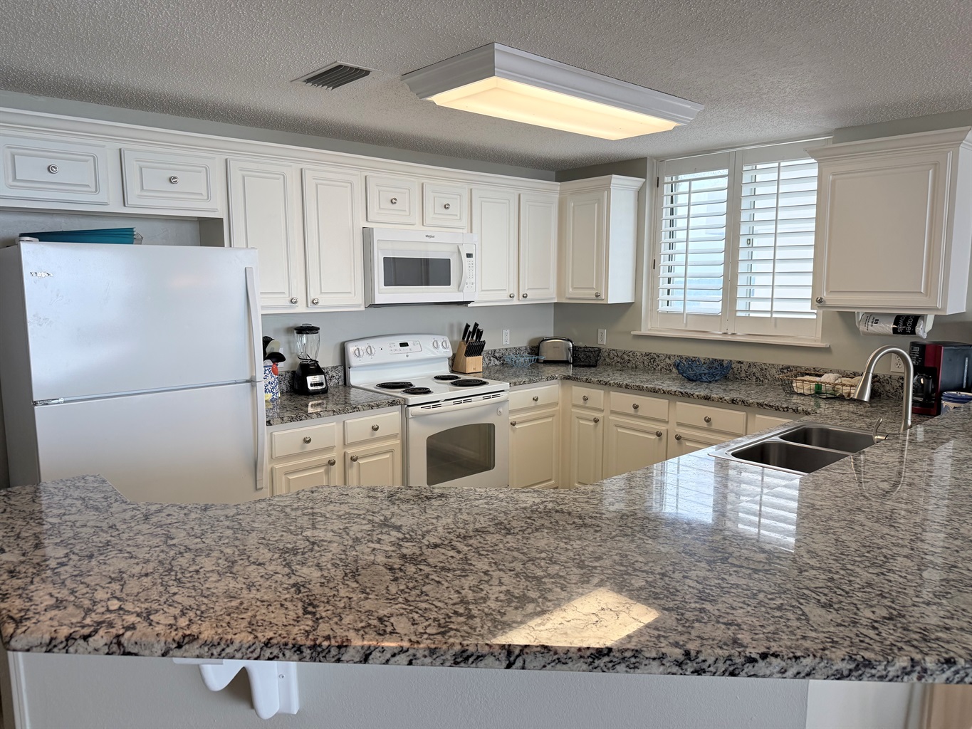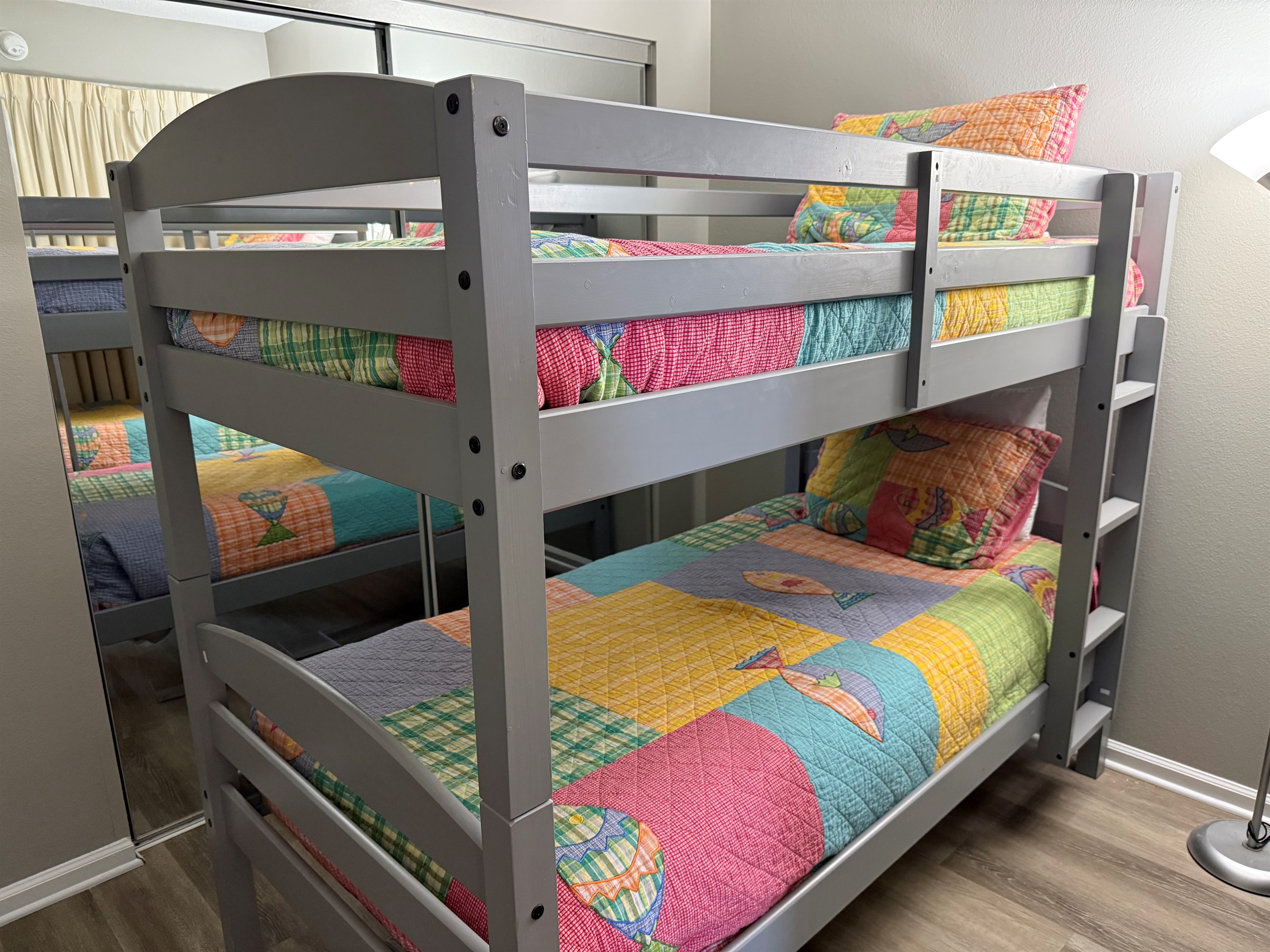 The master bedroom with a King bed adjoins a private bath with separate vanity area and has a tub/shower combo. The Queen Bedroom adjoins its own private bath with a tub/shower combo. The third bedroom has 2 sets of bunk bed and sleeps 4! It is located across from the third bath in the foyer area. This bath has a shower stall, allowing easy access for all!