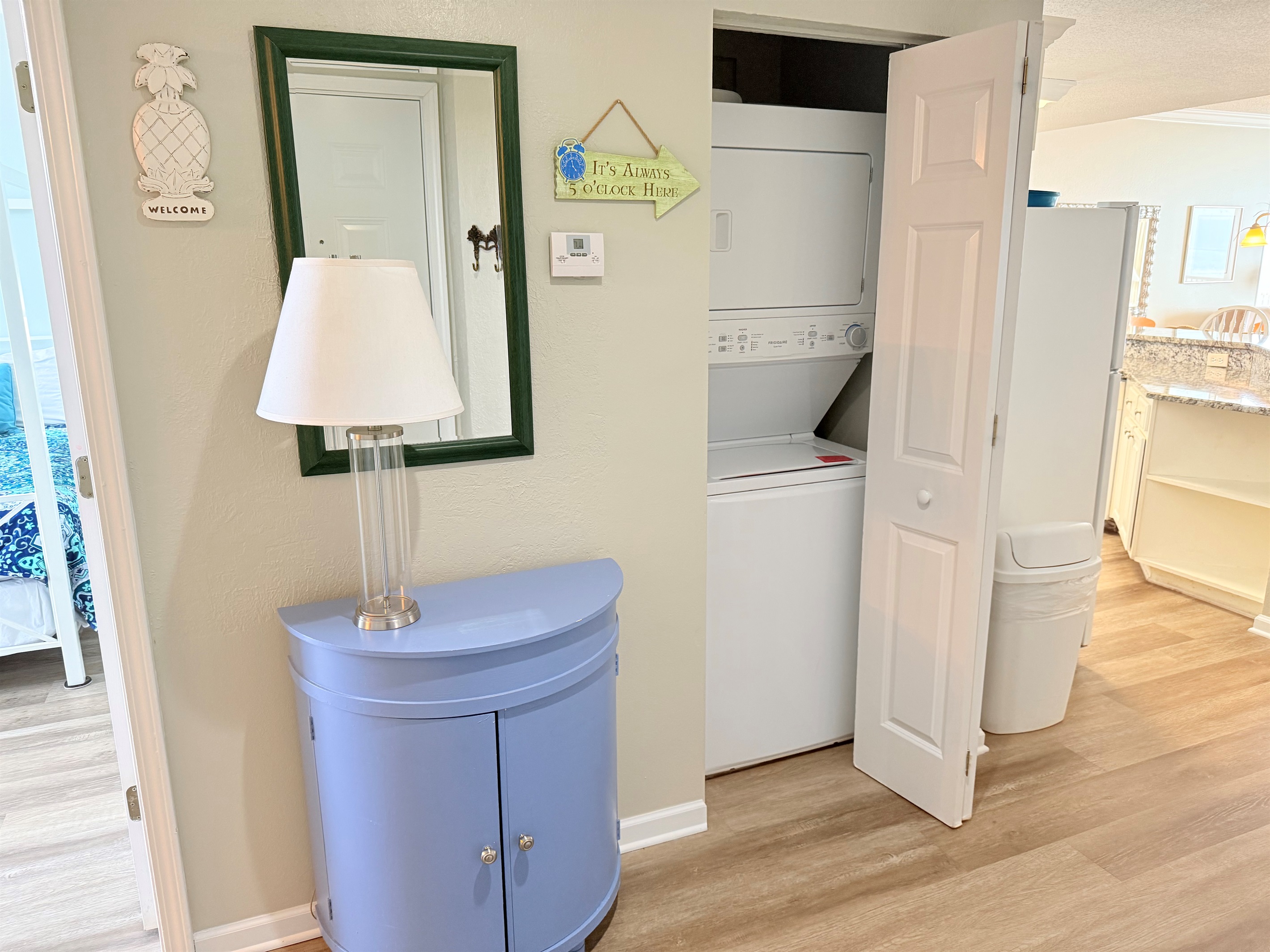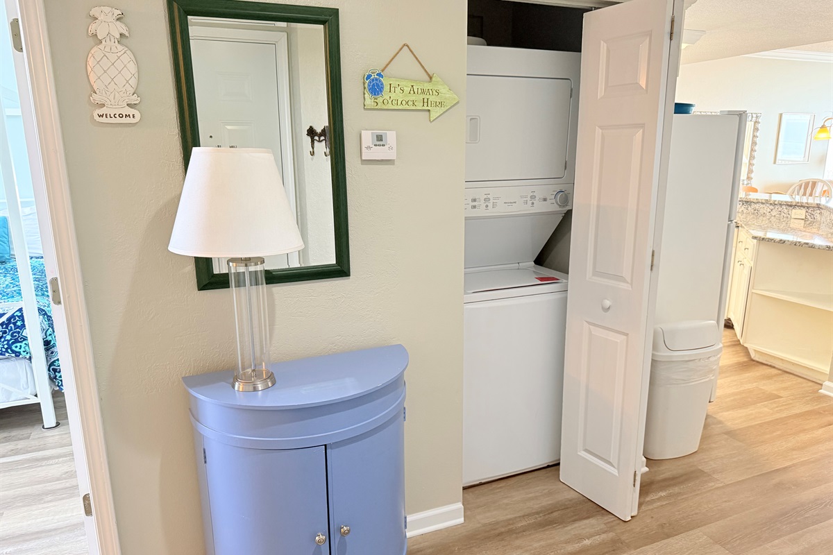 There is a TV in the living room and each bedroom, plus free WIFI, but you may bring a cord to plug-in, also. The kitchen has full size new appliances including a dishwasher. The cabinets are stocked with cookware, dinnerware and utensils. There is a stack washer/dryer in the foyer area for your convenience.