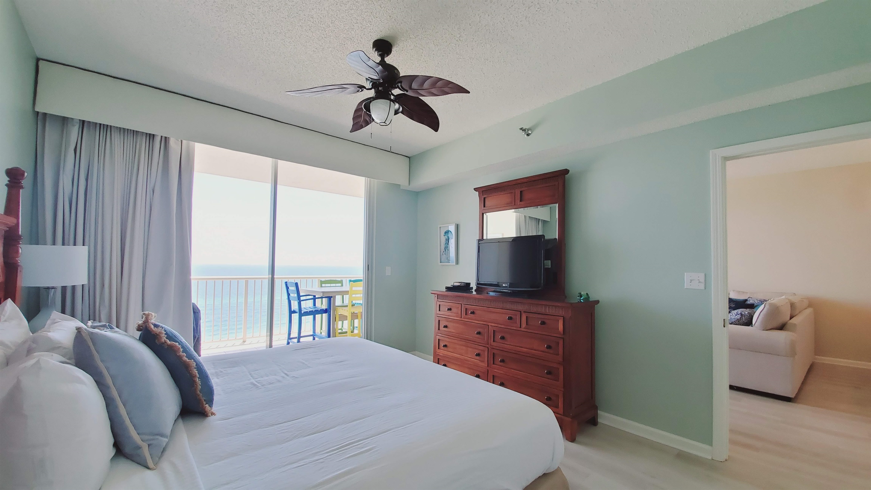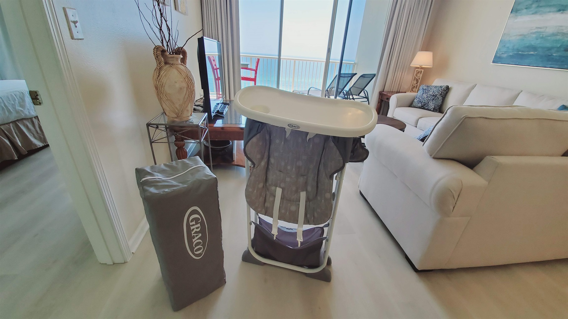 D1408 has a large, private, furnished balcony with an electric grill for dining or sipping on something cool while watching the dolphins play in the Gulf! The condo amenities include WiFi, a cottage style open floor plan, sofa sleeper, a fully stocked kitchen with full size appliances, a king master bedroom that adjoins the balcony and a private bathroom with a separate vanity area, a guest room with 2 full size beds, another full bath, and a wash/dryer. The owner provides a pack n play/crib and high chair. See pictures.