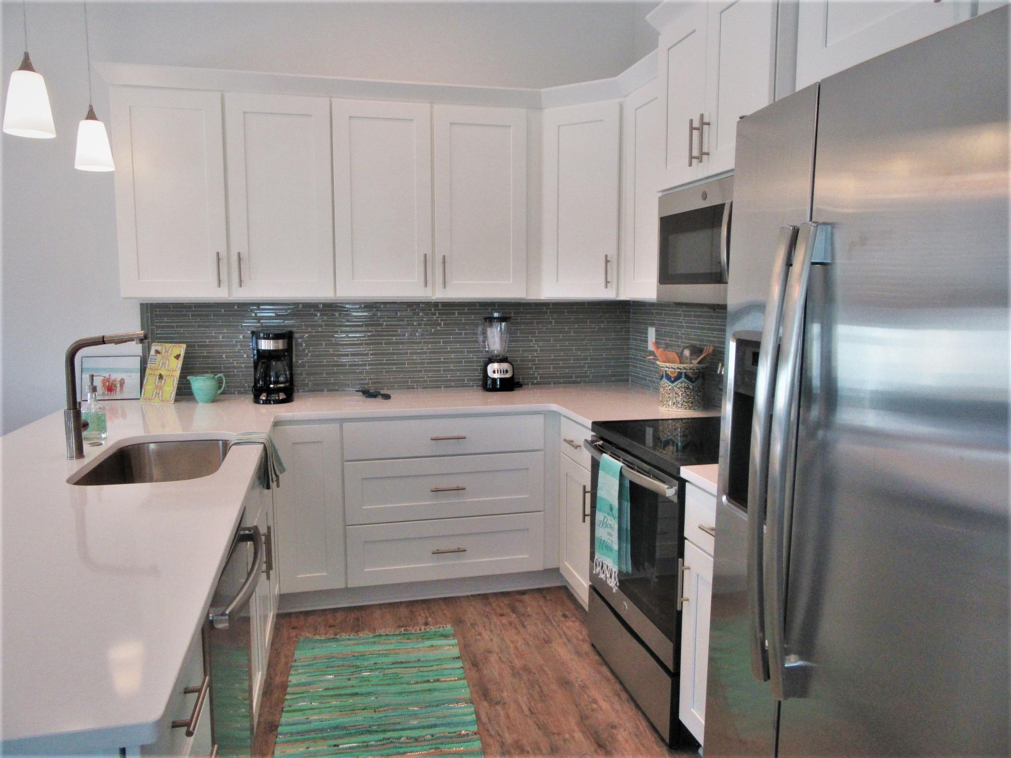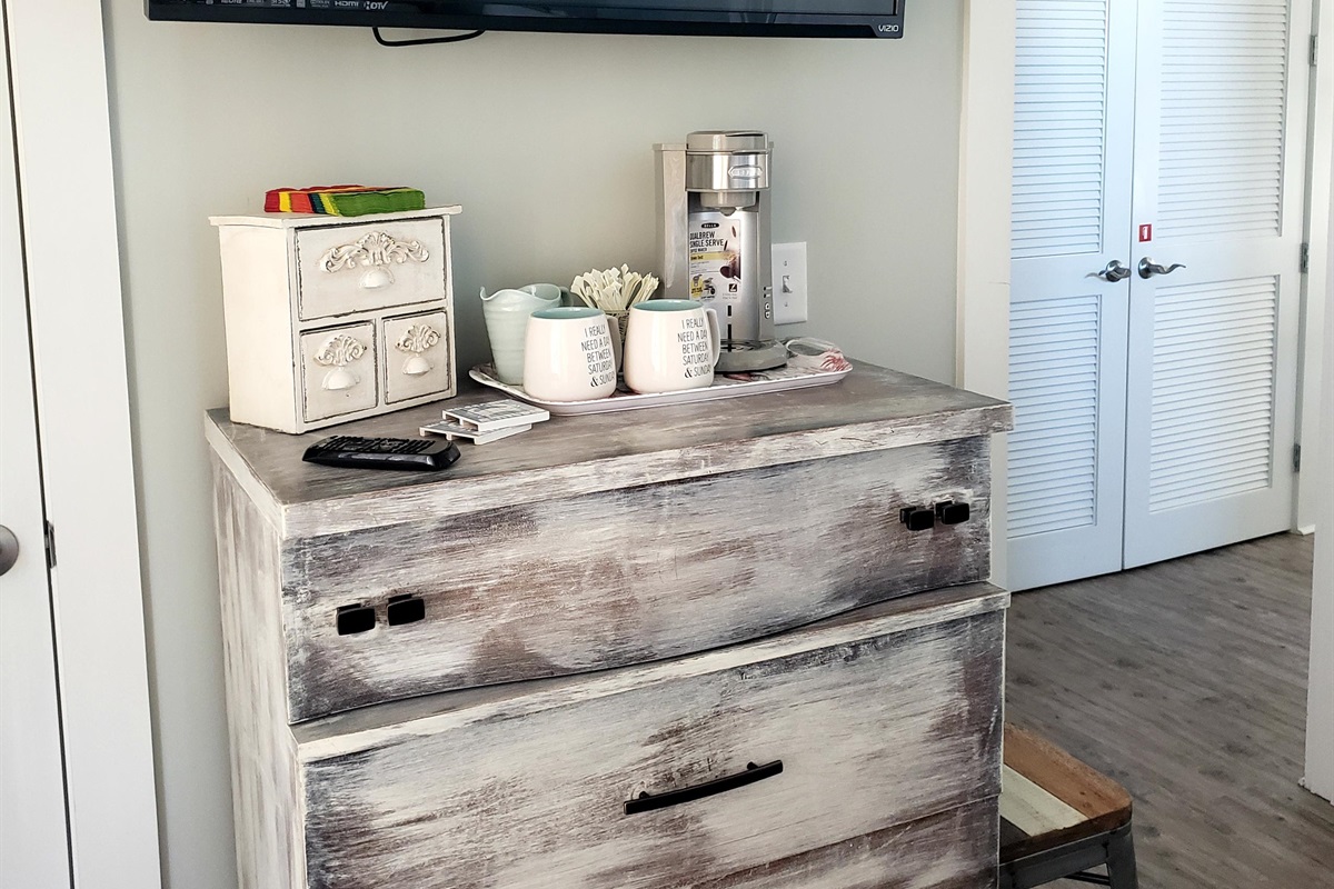 The master bedroom is furnished with a "mini" Keurig coffee station & fridge, plus the guest bedroom is furnished with a "mini" Keurig coffee station, as well. The kitchen is stocked with a full size Keurig and a standard coffee maker, utensils, dishes, cookware, toaster, blender, air fryer/toaster oven. Please bring your food, drinks & paper goods. You will find a "one day" supply of basic toiletries and products.