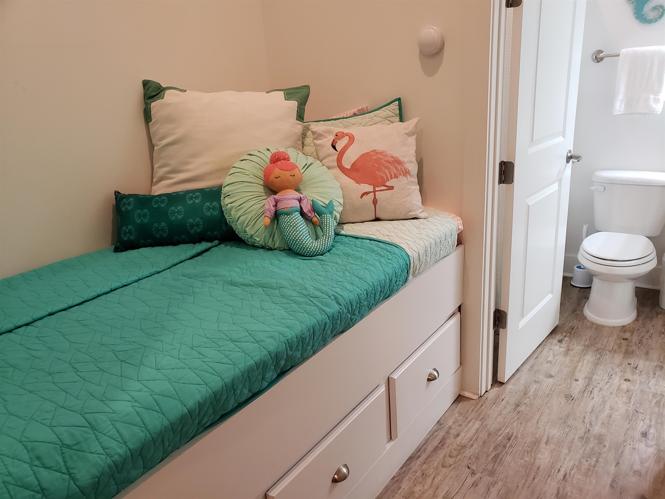 The bedding arrangement is King, Queen, Bunks, Sofa Sleeper and a daybed. The daybed will accommodate a child. All beds are made with crisp white linen and there's a set for the sleeper sofa, too. An adequate supply of bath linens are clean and ready, just bring your beach towels and make-up removal cloths so the white bath linen is preserved. A "Pack-n-Play" is provided, also!
