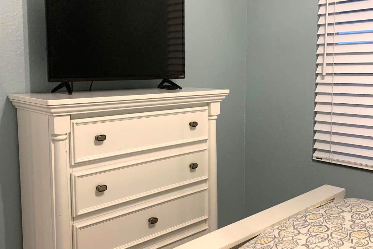 There are two bedrooms, a living/dining bar/kitchen area plus one bathroom with a walk-in shower. The first bedroom is equipped with a queen bed, a dresser, a TV and a large closet. The second bedroom is equipped with a twin over full bunk, with storage underneath, a dresser, a chair, a TV and a large closet. All beds are made with crisp white linen and there's a set for the sleeper sofa, too. An adequate supply of bath linens are clean and ready, just bring your beach towels so the bath linen is preserved.